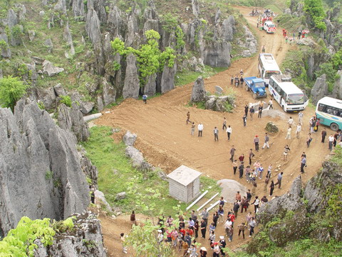 登上洛塔,只見連山綿谷,萬石如林,一塊塊青灰色的大石頭競高競秀,競美競奇,綿亙縱橫,層疊交錯,造型奇特,塔狀、蓮臺狀、羅漢狀、錐狀、刀狀、箭簇狀、帷幕狀等林立薈萃,像一個個神奇的迷宮,組成洛塔地質公園的旖旎景觀。有的玲瓏斫剔,若女繡工鐫;有的嶙峋怪異,如鬼斧神鑿;有的崢嶸巉峻,似水墨丹青;有的嵯峨兀立,藤蔓纏繞,更像一株株挺拔的古樹。高的、矮的、大的,細的。粗、瘦、皺、滑,各具特色,如人之面目相具而無一相似者,在綠樹紅花間亮麗起一道道迷人的風景。洛塔石林遍及整個山界,較集中的有楠竹車水坪石林、梭洛趙家灣石林、八仙洞石林及公路沿線的銀河塔石林,僅車水坪一帶的石林面積就達1000多畝。無論其規(guī)模面積,造型及組合情況,洛塔石林都可與云南石林媲美。
