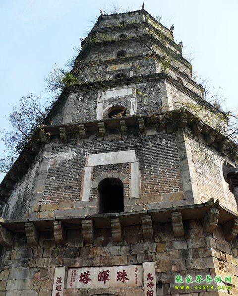 塔高10丈5尺,磚石結(jié)構(gòu),七層八棱,石階旋梯。正門西南向,上方漢白玉橫額鐫刻著斗大楷書“珠暉塔”三字,兩邊漢白玉雕刻楷書對聯(lián):“高峙船山遠綿學(xué)脈,流回耒水廣助文瀾”。塔基四周刻有飛禽走獸圖形,塔內(nèi)拱門嵌有石刻碑文,為江蘇學(xué)政王先謙撰寫、寧夏知府黃自文手書,原為6塊,現(xiàn)存4塊。塔前建有廊廡,僧房數(shù)楹。塔尖銅頂,映日生輝。